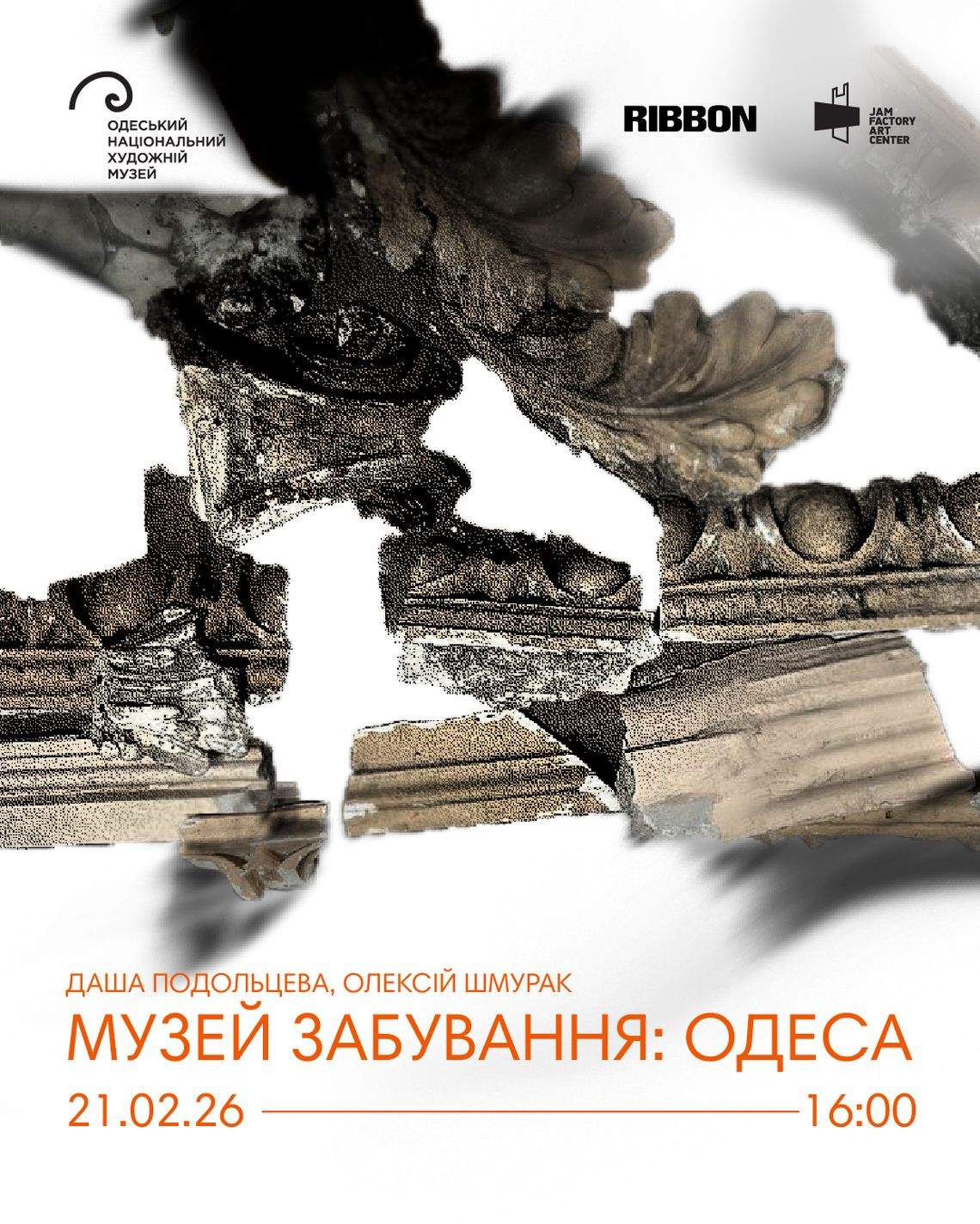 Відкриття виставки відбудеться 20 лютого о 16:00 в Одеському національному художньому музеї (Софіївська, 5а). Вхід на відкриття — вільний. «Музей забування: Одеса» — site specific аудіовізуальна інсталяція художниці Даші Подольцевої та композитора Олексія Шмурака, створена у співпраці з Одеським національним художнім музеєм.