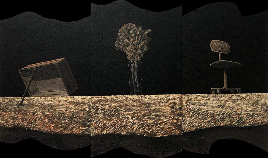 “Птахаловка, квіти та стілець”, OSB, 145 х 250 см., 2024