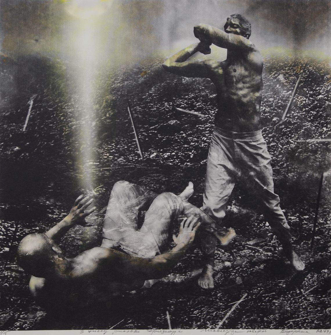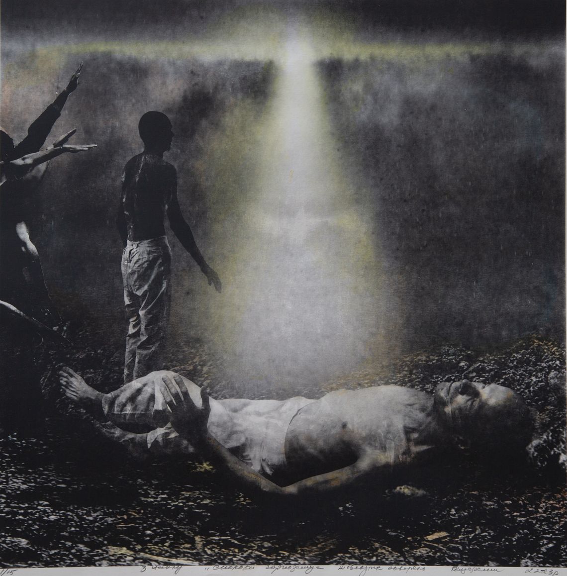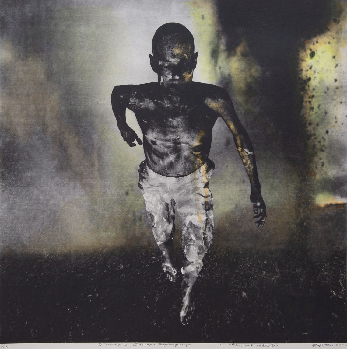 Коли 24 лютого 2022 року почалося повномасштабне вторгнення, важко було через блок-пости навіть дістатися до майстерні, і я працював удома. Чомусь пригадалися роботи художників того покоління, яке пережило Другу світову війну. Ці роботи можна було часто бачити на виставках. Якось само собою сталося, що я почав стилістично наближатися до робіт тих художників. Мені потім закидали, що ця стилістика нагадує 1960–1970-ті, коли художник вдавався до воєнної теми. Серія була задумана як цикл тиражної графіки, але виконаної в більш «демократичний» спосіб – не літографія чи офорт, а шовкодрук. У першу чергу зробив достатньо велику кількість таких графічних зображень. Процес відбувався в часи, коли люди вимушено залишали країну, панувала суцільна розгубленість, ніби утверджувалося відчуття дезорієнтації – питання «що робити?», «куди рухатися?», «як бути далі?» ставали для багатьох людей головними. Ми всі пам’ятаємо цей період – відсутність упевненості, гармонії всередині себе, внутрішній світ наче обвалюється, людина вимушена діяти не із власної волі. Коли вся серія була готова, я зрозумів, щоб ідея виглядала б більш переконливою, для цілісності майбутнього проєкту бракувало відчуття руху. Тоді вирішив повернутися до відео, яким починав займатися ще на проєктах «Аутентифікація», «Жорна часу». Це був організаційно складний процес: треба залучити акторів, оператора, зробити монтаж і звуковий супровід. Поряд з цим мені здалося важливим деяку частину графічних робіт відтворити у живопису.